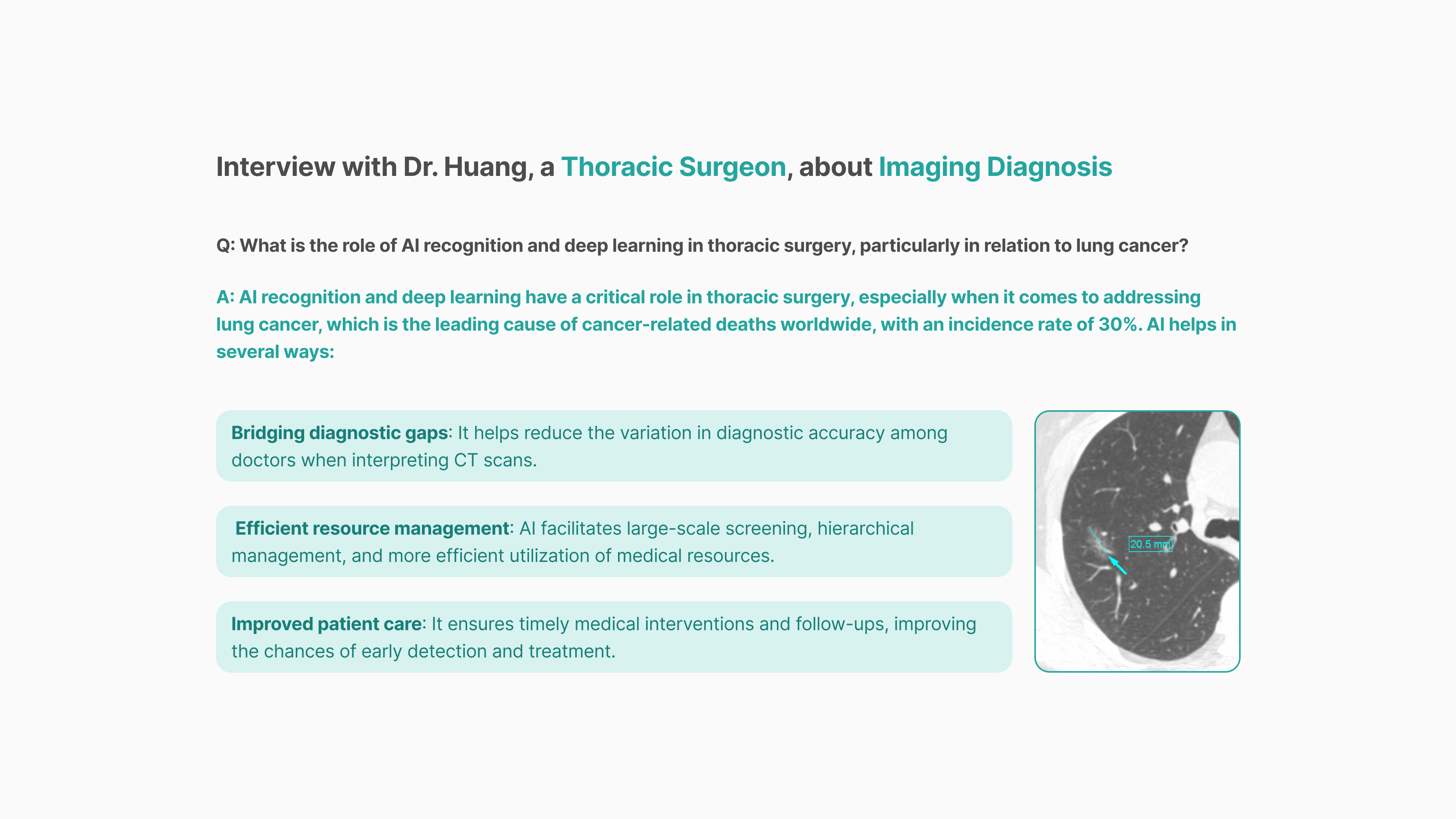 The objective of this interview with Dr.Huang is to explore the role of AI diagnosis in thoracic surgery, particularly in addressing the challenges associated with lung cancer diagnosis. And its impact on society and future healthcare system.