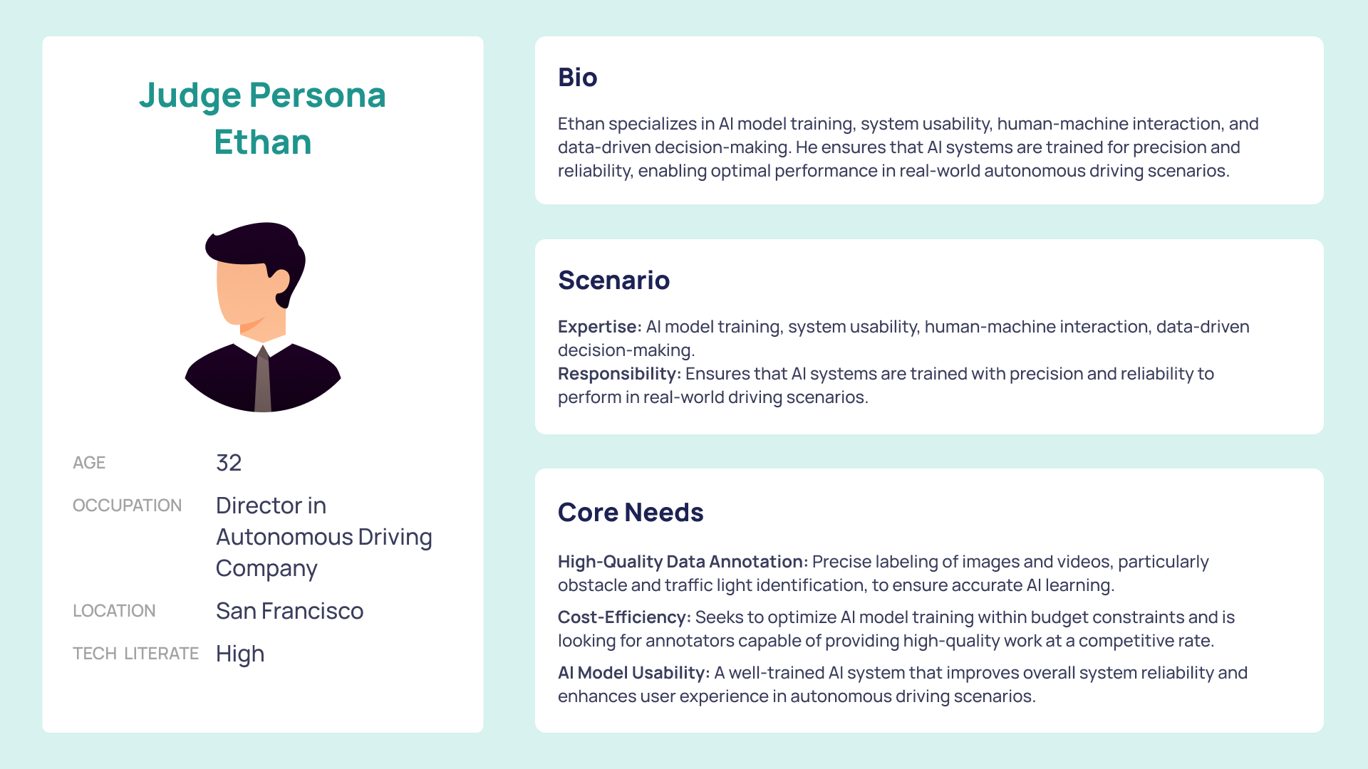 Once moving to the interface and styling, we developed a user persona—derived from our affinity maps—to better understand key usage scenarios and the core needs of our users. This persona helped ensure that the UI team (Yixing, Ivy, and Zhe Li) aligned on a shared understanding of our target user."
