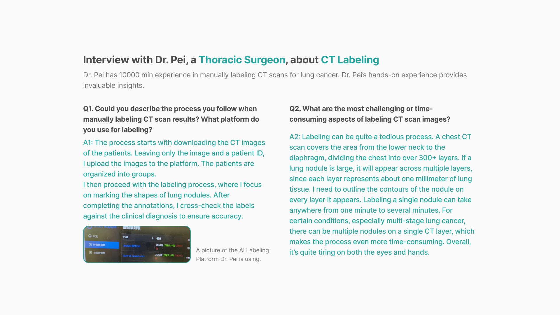 Dr. Pei has about 10000 min experience in manually labeling CT scans of lung cancer. Given that our AI labeling software is designed to automate and assist in data labeling, Dr. Pei’s explains his understanding of the pain points, challenges, and necessary precision in medical labeling.