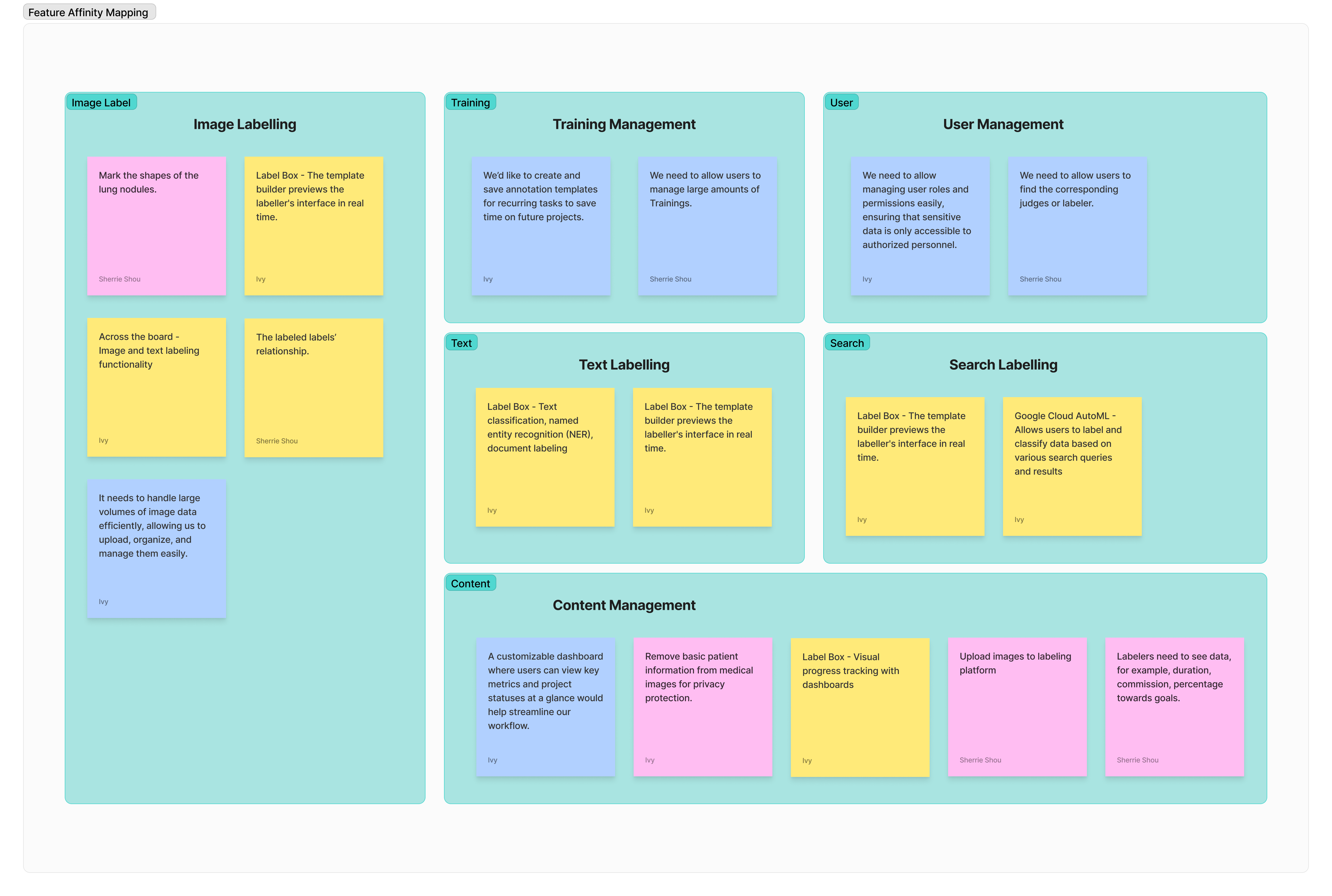 During team meetings with product managers, affinity mapping has been incredibly useful for organizing ideas gathered from our research, as well as client feedback. For example, we use sticky notes to capture insights from different sources, then rearrange them into sections. This method helps us identify key features and ultimately develop a feature list.