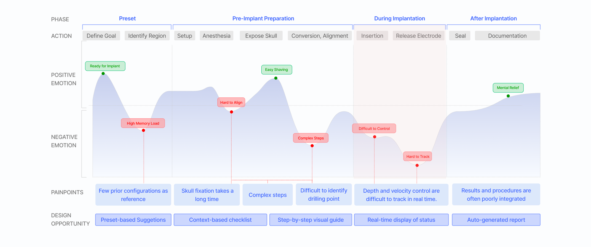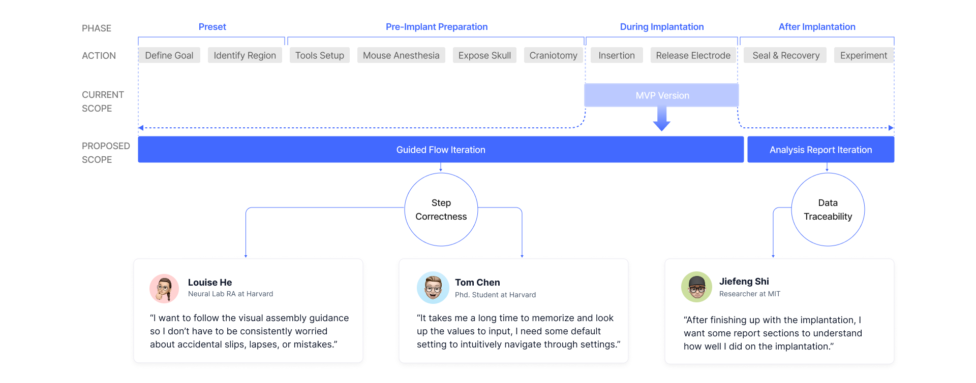 The implantation process spans multiple phases, from goal definition and preparation to execution and post-implant analysis.Our initial MVP focused on the most error-prone and cognitively demanding phase—the implantation itself—where usability issues have the greatest impact on outcomes.Following usability testing, we conducted post-test interviews and surveys to better understand user behavior, mental load, and unmet needs across the broader workflow.Insights from these qualitative and quantitative findings informed how we defined the next areas for expansion.