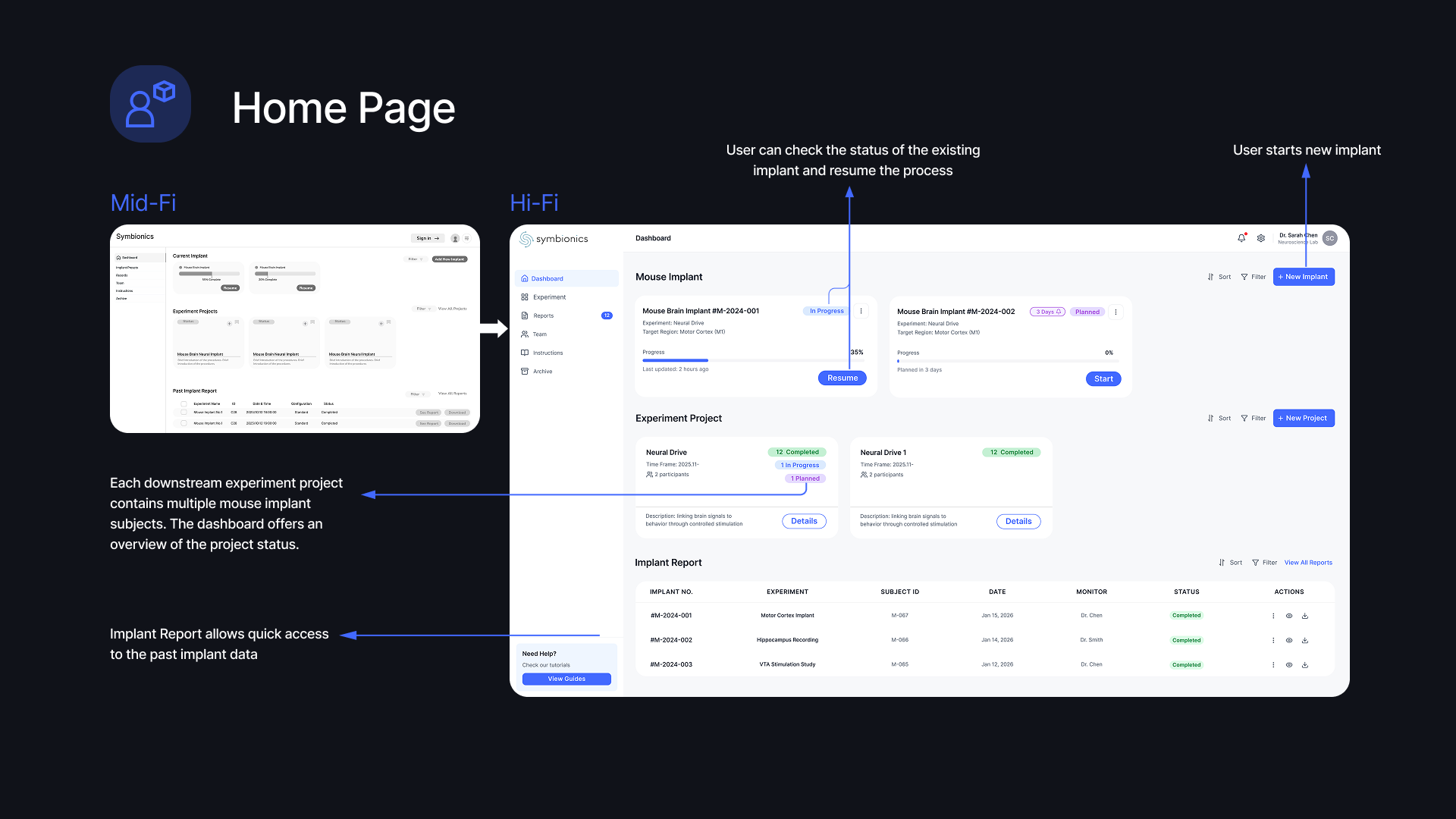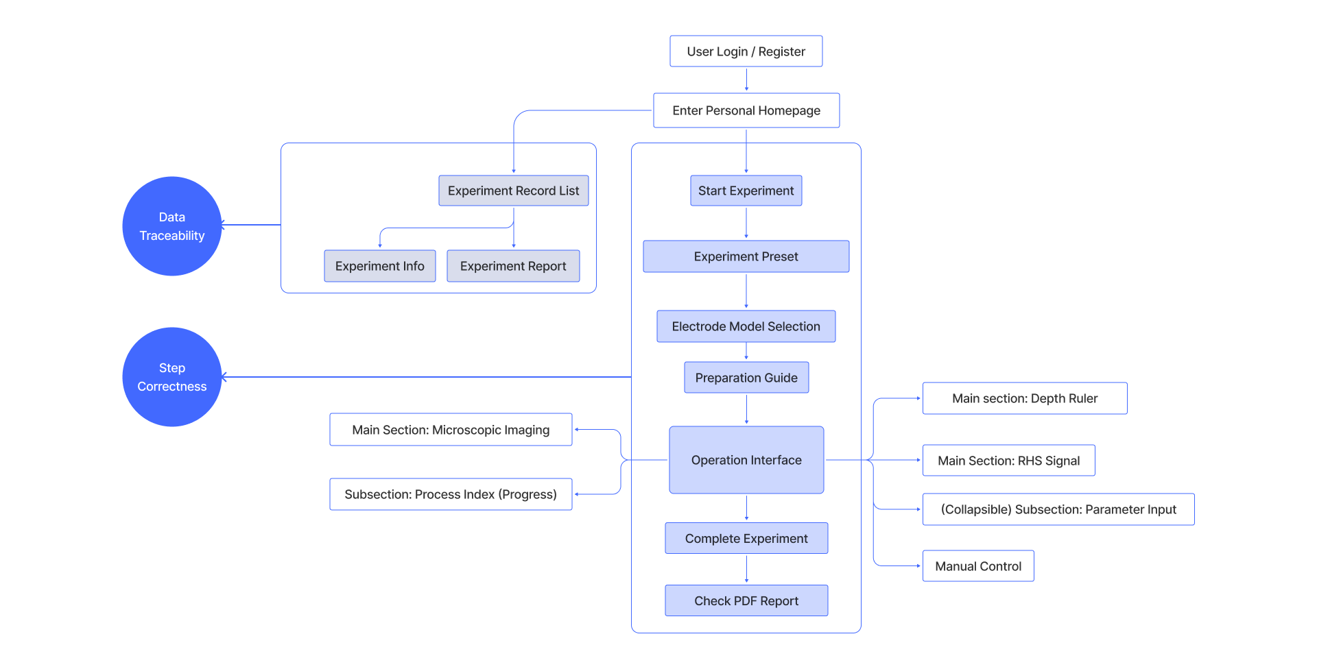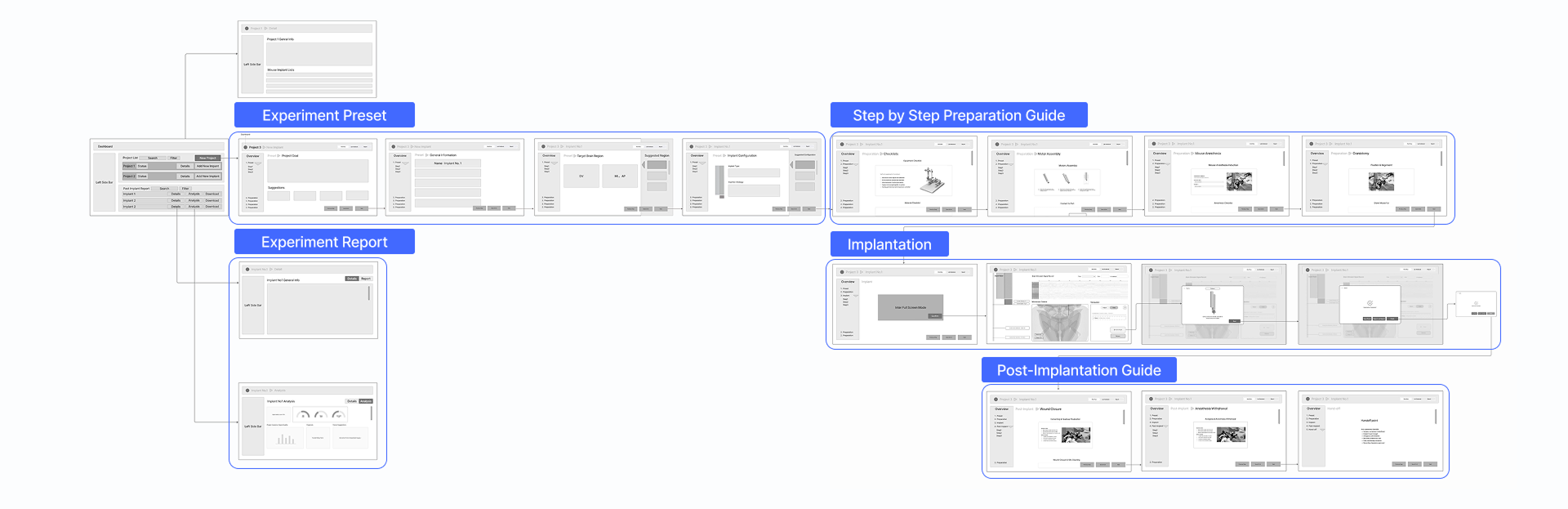 We then focused on building a guided workflow that supports users before, during, and after implantation.Key concepts include presets, step-by-step guidance, real-time status feedback, and auto-generated reports.