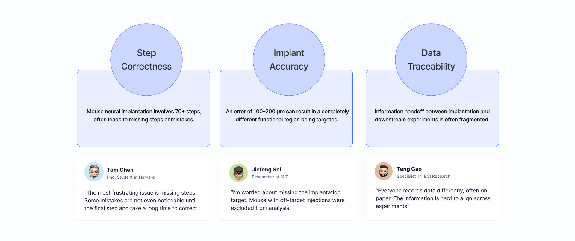 Through field observations and interviews, we identified three critical challenges that directly affect the reliability and scalability of mouse neural implantation.